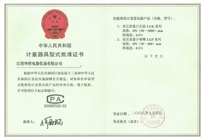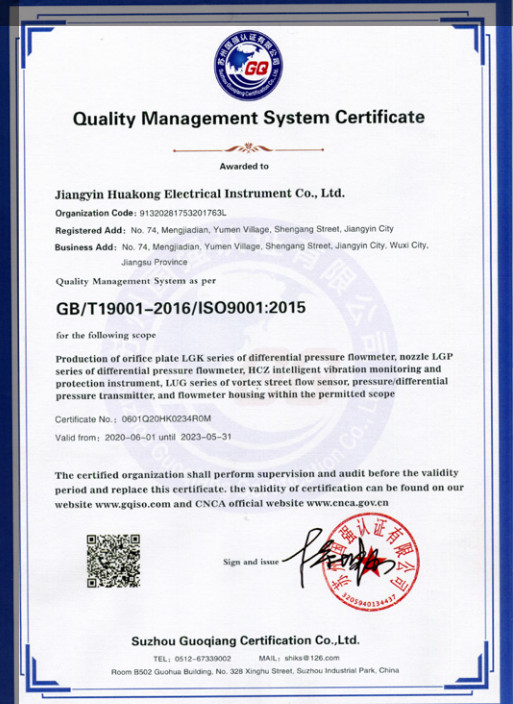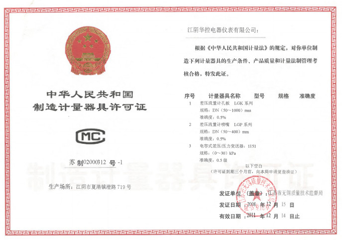 江陰華控電器儀表有限公司主要從事節流裝置,標準孔板,文丘里管,標準噴嘴的生產銷售。公司擁有近20多年的生產制造經驗,并承接工程配套任務,同時還遠銷亞、非等。按ISO9001準體系運行,實行質量管理。公司取得了特種設備生產許可證,產品符合中華人民共和國標準GB/T2624T以及國際標準IS0516的規定,符合市監特涵〖2018〗515號文件和壓力管道元件TSG D7006-2020要求。